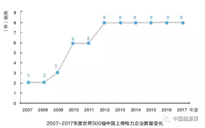 今年7月20日20時,2017年度世界500強(qiáng)榜單發(fā)布,中國上榜企業(yè)數(shù)量由十年前的30家上升到115家,增長約2.8倍。2017年全球共有24家電力企業(yè)上榜,中國上榜電力企業(yè)由2家增至8家,數(shù)量占比由1/10上升至1/3。