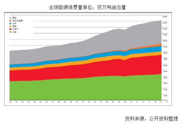 以發(fā)展眼光來看,全球的能源結(jié)構(gòu)正在發(fā)生深刻的改變。2015 年,全球一次能源消費僅增長1.0%,遠低于十年平均水平1.9%,這是自1998 年以來的最低增速(2008 年金融危機除外)。其中,除了核電以外,剩下的石油、天然氣、煤炭、水電增長速度均低于十年均值。而可再生能源的情況卻相反: 2015 年,可再生能源發(fā)電量繼續(xù)增長,在全球能源消費中的比例重達2.8%, 遠高于十年前0.8%的水平??稍偕茉窗l(fā)電量增長15.2%,其增量更是創(chuàng)歷史新高,幾乎是全球發(fā)電量的全部增量。