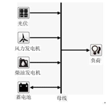 風力發(fā)電和光伏發(fā)電只有設備自身成本和運行維護成本,且不會產生任何污染,是理想的綠色環(huán)保能源,因此以風力發(fā)電機和光伏陣列作為系統(tǒng)主要電源向負荷供電。但考慮到其發(fā)電量受天氣影響較大,具有顯著的間歇性和隨機性特點,因此需要備用電源,以保證系統(tǒng)供電可靠性。柴油發(fā)電機因其靈活、便捷、可靠的特點,可以很好地滿足備用電源要求。同時采用蓄電池作為儲能設備,在風光發(fā)電量大于負荷時存儲多余能量,在風光發(fā)電量不足時放出存儲能量,在系統(tǒng)中起“削峰補谷”的調節(jié)作用。由風光柴蓄組成的獨立微網(wǎng)系統(tǒng)可以經濟可靠地為孤立海島供電。