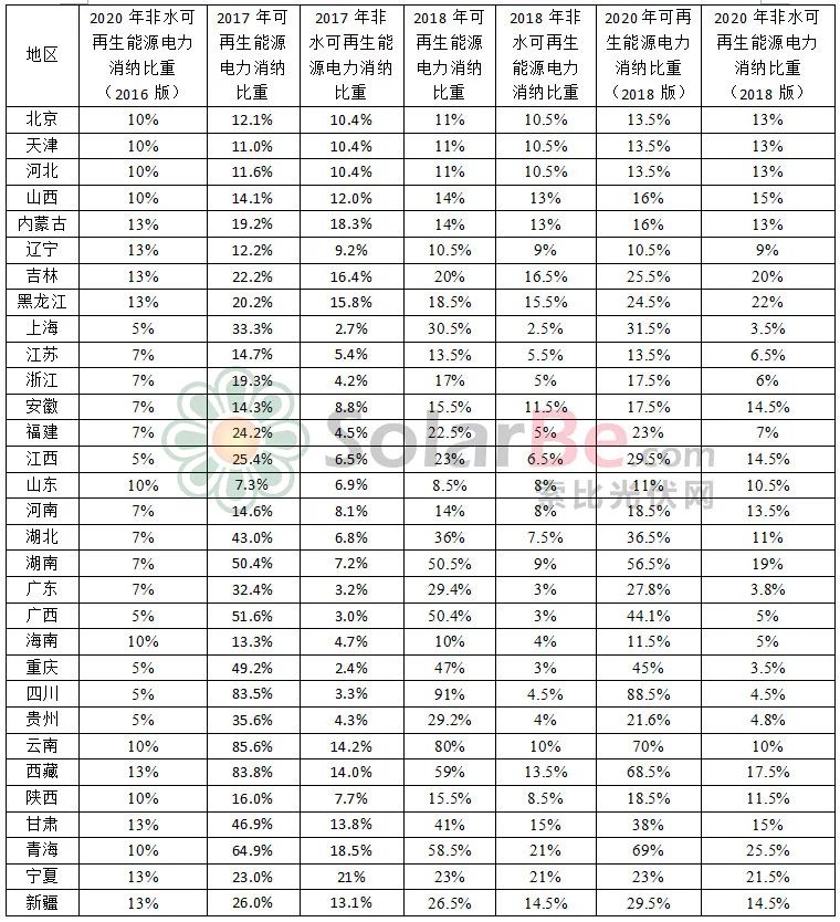 2018年3月23日,國家能源局綜合司發(fā)布《關于征求<可再生能源電力配額及考核辦法(征求意見稿)>意見的函》,開始第一輪征求意見。從這一稿來看,不僅增加了全部可再生能源消納占比的要求,還結合2017年實際情況,提出2018年消納要求,并對部分省份的非水可再生能源電力消納比重目標進行調(diào)整,具體如下: