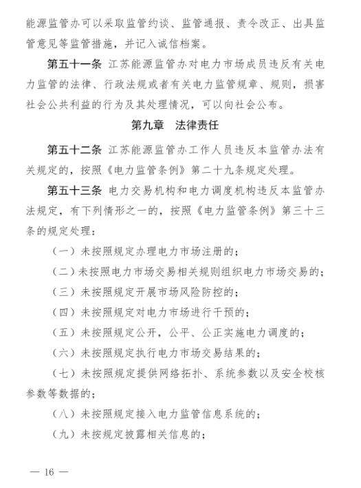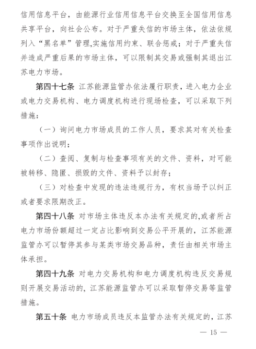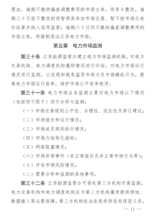 最后一個比較明顯的是對市場主體繳納偏差考核費用的時間節(jié)點設(shè)立了緩沖期,也明確了逾期三十天拒不整改的就暫停市場交易,不按市場化電價結(jié)算;逾期六十天的強制退出江蘇電力市場,可以說處罰條件和手段更明確了。