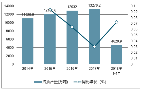 2018年1-4月中國(guó)汽油產(chǎn)量為4629.9萬(wàn)噸,同比增長(zhǎng)7.2%;2017年1-12月中國(guó)汽油產(chǎn)量為13276.2萬(wàn)噸,同比增長(zhǎng)3.0%。