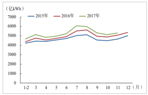 2015—2017年我國(guó)全社會(huì)分月用電量趨勢(shì)圖
