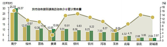說(shuō)明:2014年上半年,廣西電網(wǎng)公司12個(gè)地市供電局所轄縣級(jí)供電企業(yè)累計(jì)售電量同比有所提升。其中,累計(jì)售電量最高、增長(zhǎng)幅度最大的均為南寧供電局。