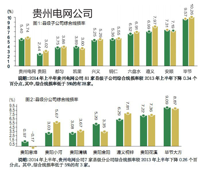 說(shuō)明:2014年上半年,貴州電網(wǎng)公司7家縣級(jí)分公司綜合線損率較2013年上半年下降0.26個(gè)百分點(diǎn)。其中,綜合線損率低于5%的有3家。