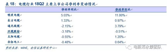 凈利率方面,18年二季度6家公司中有2家凈利率同比上升,其余四家同比都有所下降,但環(huán)比來(lái)看改善都很明顯,僅有漢纜股份一家環(huán)比下降。