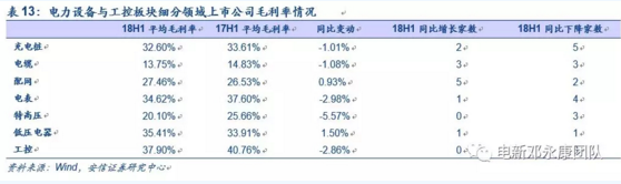 電力設(shè)備與工控板塊上半年業(yè)績(jī)表現(xiàn)平穩(wěn),低壓電器與配網(wǎng)最為亮眼:2018年上半年,電力設(shè)備板塊38家上市公司共實(shí)現(xiàn)歸母凈利潤(rùn)89.19億元,同比增長(zhǎng)16.06%。從細(xì)分板塊來(lái)看,低壓電器、配網(wǎng)和電纜的表現(xiàn)較為突出,大部分企業(yè)實(shí)現(xiàn)凈利潤(rùn)的同比高增長(zhǎng),其中低壓電器和配網(wǎng)的毛利率同步上升。工控板塊有所分化,平臺(tái)型公司匯川技術(shù)和麥格米特以及產(chǎn)品型公司信捷電氣依然具備強(qiáng)競(jìng)爭(zhēng)力。