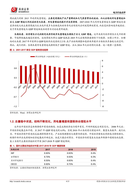 中長期來看,用電量增速與名義 GDP 增速存在較強的相關性,如果同時考慮國內經濟結構轉型以及節(jié)能減排的持續(xù)推動,單位 GDP 能耗與電耗均有望保持平穩(wěn)下行。據(jù)此,我們預計,國內用電量增速有望維持在 4-6%的中低速水平,基于此電力裝機總規(guī)模仍需適度控制。