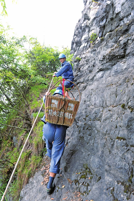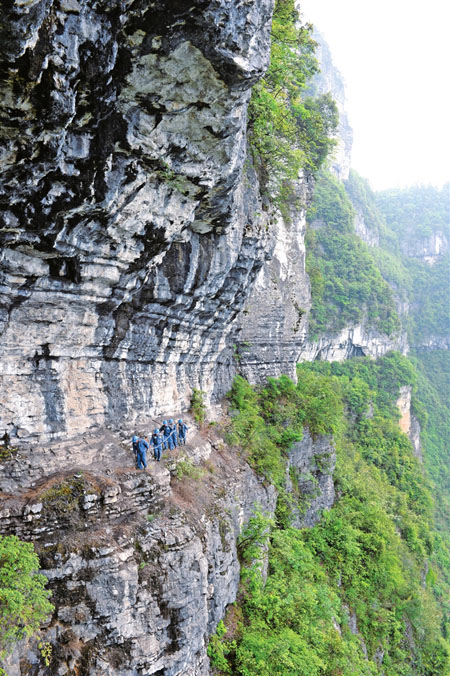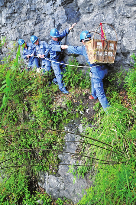檢查情況良好,我們再次出發(fā),前方拐彎處又見懸崖峭壁。巡線員用繩索拉起“護欄”,我們一手抓繩,一手扶壁,順利地通過了又一個險境。
