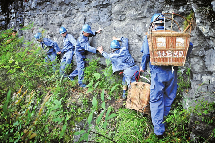 2014年5月9日,清晨6時。貴州省遵義市道真縣東街社區(qū)的陳利用早起準備下地,對經(jīng)過門前的一隊肩扛背夾的人們打著招呼。背夾用竹條或藤條編成,在當?shù)卦⒁饧?,常用作男方向女方下定時的聘禮。但陳利用這句招呼其實是玩笑,因為這一群人不是去下聘的,他們是貴州電網(wǎng)公司遵義供電局道真工作站的巡線隊。