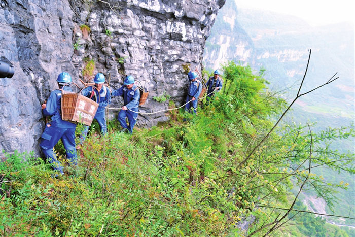 在懸崖上這樣的驚險操作,卻是背夾巡線隊的日常。李暢 攝