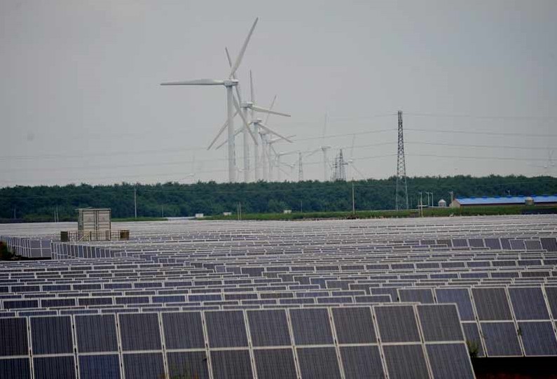 2013年9月5日拍攝的江蘇鹽城市東臺(tái)風(fēng)光漁互補(bǔ)新能源基地。風(fēng)光漁互補(bǔ)是指上有風(fēng)電、中有光電、下有養(yǎng)殖的三層立體收益綜合體。東臺(tái)市充分利用沿海豐富的風(fēng)、光資源,每一分土地實(shí)行立體開發(fā),由中節(jié)能太陽能科