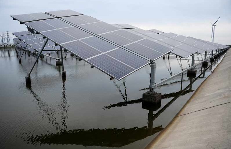 2013年9月5日拍攝的江蘇鹽城市東臺(tái)“風(fēng)光漁”互補(bǔ)新能源基地。“風(fēng)光漁”互補(bǔ)是指上有風(fēng)電、中有光電、下有養(yǎng)殖的三層立體收益綜合體。東臺(tái)市充分利用沿海豐富的風(fēng)、光資源,每一分土地實(shí)行立體開發(fā),由中節(jié)能太陽能科技有限公司投資10億元,利用國(guó)華公司40萬千瓦陸上風(fēng)機(jī)形成的灘涂地面空間建成光伏電站。江蘇海辰集團(tuán)投資2000萬元,投放青蟹、對(duì)蝦、梭子魚,建成1000畝的養(yǎng)殖塘面,塘面養(yǎng)殖畝產(chǎn)值約為7000元,純收益達(dá)3000元以上。截至目前,東臺(tái)市沿海并網(wǎng)發(fā)電的風(fēng)電、光電裝機(jī)總?cè)萘恳堰_(dá)510兆瓦,成為全球單體規(guī)模最大的灘涂地面光伏電站和國(guó)內(nèi)最大“風(fēng)光漁”一體化光伏電站,初步顯現(xiàn)出巨大的生態(tài)效益和可觀的規(guī)模效益。
