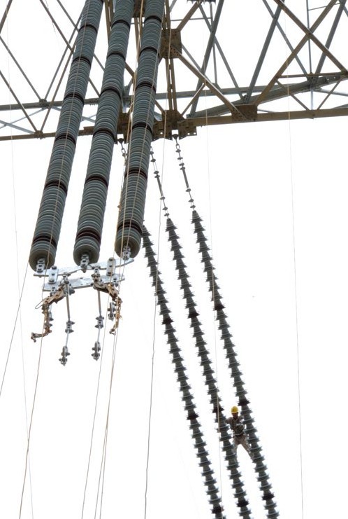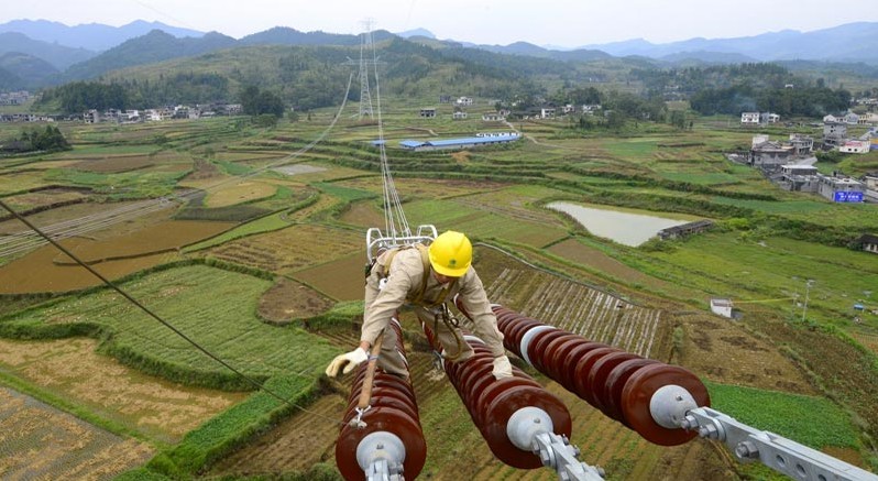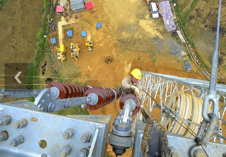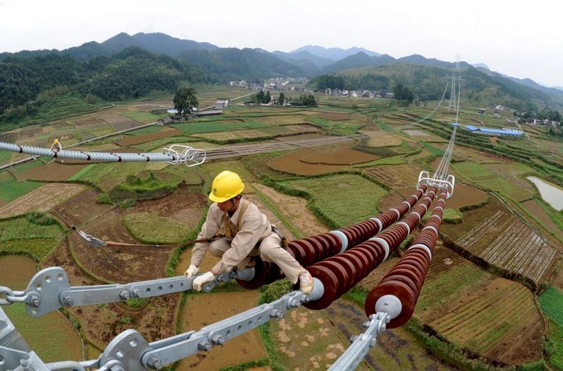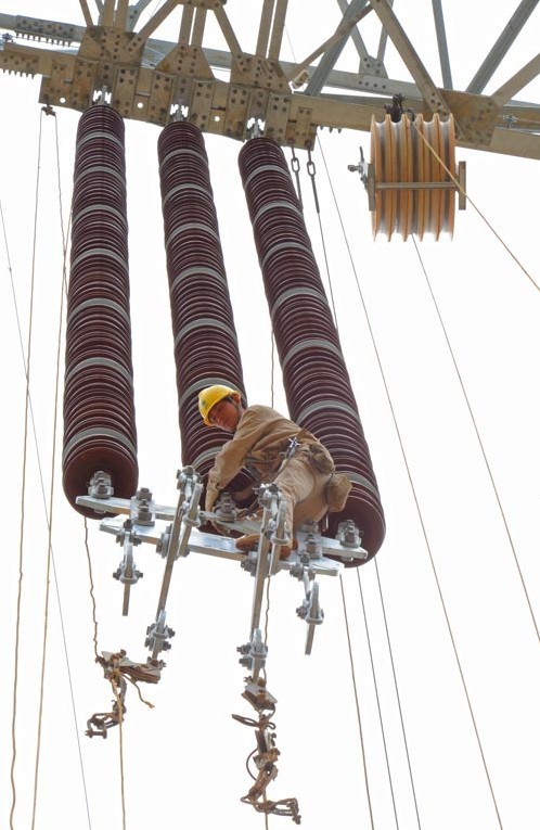 2013年9月26日,在貴州省銅仁市松桃縣,江蘇省送變電工程公司工作人員在±800千伏特高壓工程黔5標(biāo)段進(jìn)行架線施工。溪洛渡左岸至浙江金華±800千伏特高壓直流輸電工程是國家電網(wǎng)公司投資建設(shè)的又一條連接我國西南水電基地和東部負(fù)荷中心的能源大通道,起于四川宜賓雙龍換流站,終于浙江金華換流站,新建±800千伏直流輸電線路約1680公里,途經(jīng)四川、貴州、江西、湖南和浙江五省。工程額定輸送容量800萬千瓦,動(dòng)態(tài)投資238.55億元。該工程建成后,每年可將西南地區(qū)約400億千瓦時(shí)清潔水電輸送至浙江,相當(dāng)于每年節(jié)省標(biāo)煤1228萬噸,減排二氧化碳超過3400萬噸。工程計(jì)劃于2014年6月實(shí)現(xiàn)雙極低端送電,2014年年底全部建成投運(yùn)。