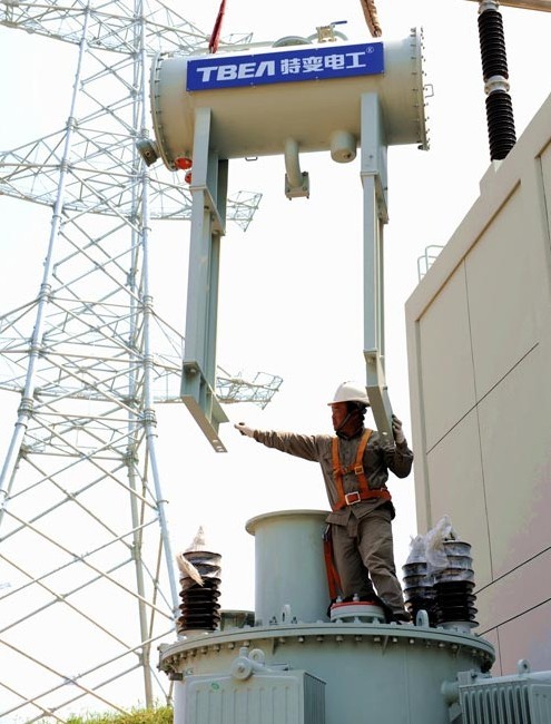6月21日,在1000千伏特高壓浙北變電站,湖北省送變電工程公司施工人員頂著烈日,精心安裝1000千伏中性點(diǎn)高抗設(shè)備,并對(duì)安裝完畢的110千伏構(gòu)架?chē)娡苛?,?dāng)日,該站1000千伏高抗主設(shè)備全部安裝完畢。圖為工作人員