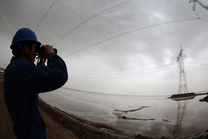 國網(wǎng)青海檢修公司的輸電線路驗收地面配合人員通過用望遠(yuǎn)鏡對高空驗收人員進(jìn)行監(jiān)護(hù)。目前,新疆與西北主網(wǎng)聯(lián)網(wǎng)750千伏第二通道工程驗收工作正在有序進(jìn)行中。該工程在青海境內(nèi)涉及2站4線,大部分處于海拔3000米以上,地處高原、自然環(huán)境惡劣、地質(zhì)情況復(fù)雜,有鹽湖、沼澤和戈壁,是全線路各標(biāo)段中難度系數(shù)最大、工程技術(shù)要求較高的標(biāo)段,其中跨越鹽湖區(qū)共計85基鐵塔,40.34公里線路。