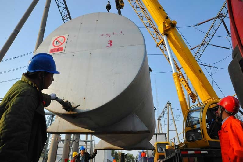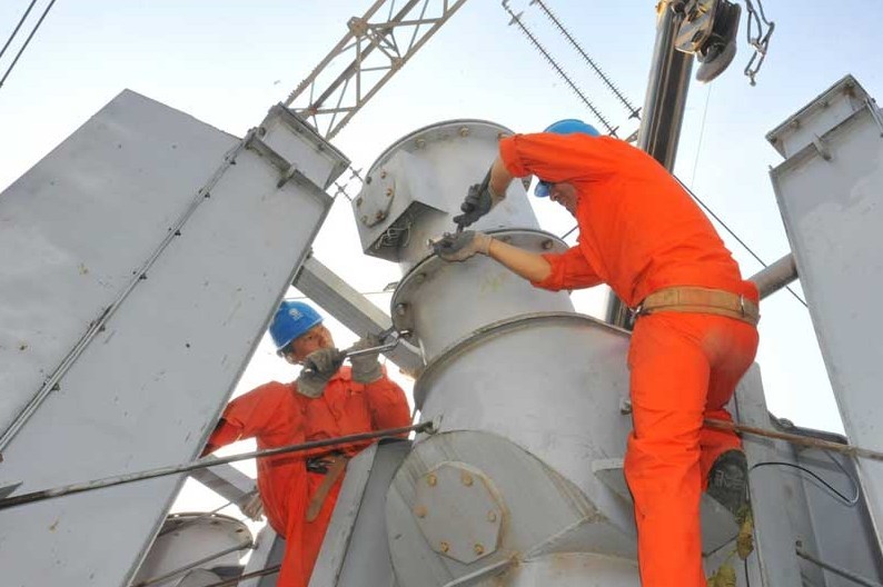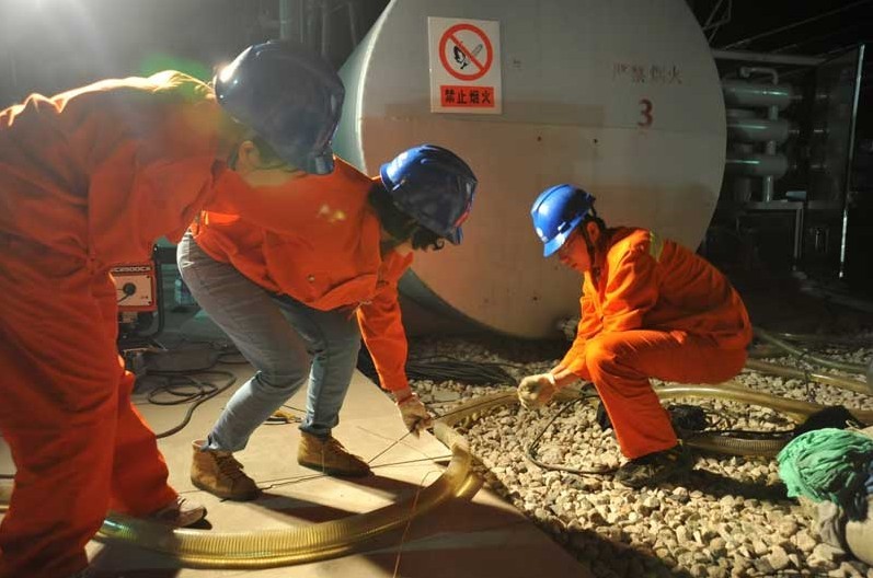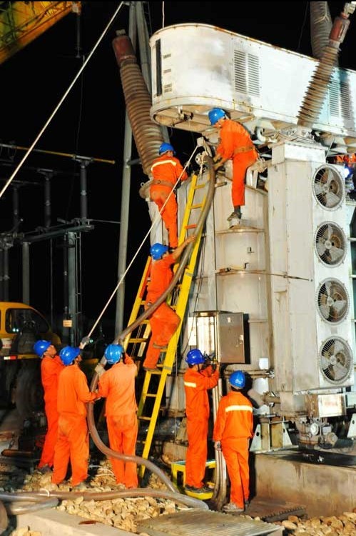 早晨7時(shí),按檢修工區(qū)主任高紅英的提議,作業(yè)人員首先將兩個(gè)大油罐吊裝到位,主變里的油需要抽出來(lái)重新過(guò)濾,然后再將主變腔體抽成真空的情況下重新注入,這是一個(gè)漫長(zhǎng)的過(guò)程,他們要一邊進(jìn)行這個(gè)工作,一邊完成其他的工作比如冷卻器等附件的安裝,這樣能節(jié)省至少八個(gè)小時(shí)的時(shí)間,在她看來(lái),主變就位,能往前趕一個(gè)小時(shí),就為電網(wǎng)安全保障一個(gè)小時(shí)。