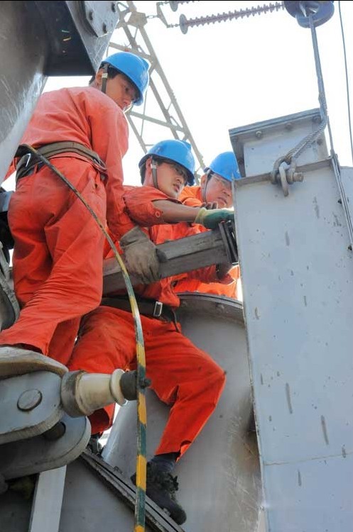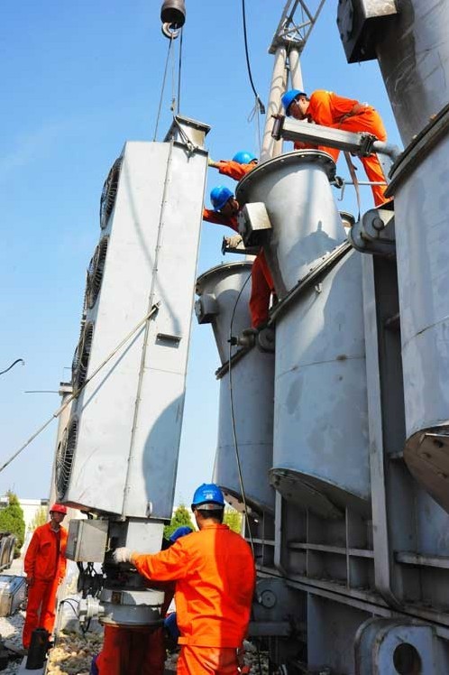 老式主變壓器的冷卻器拆卸起來(lái)容易,裝起來(lái)卻很難,高度傾斜度都剛剛好的時(shí)候才能裝的上,徐海林一邊指揮吊車(chē),一邊指揮作業(yè)人員,“向上點(diǎn),再上一點(diǎn)兒,一點(diǎn)兒,稍左,小鉤提升,再提,好,好,好!”下午13時(shí)50分,整整四個(gè)小時(shí)過(guò)去了,六組冷卻器全部裝配到位,徐海林的嗓子也啞了。