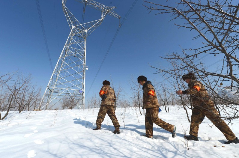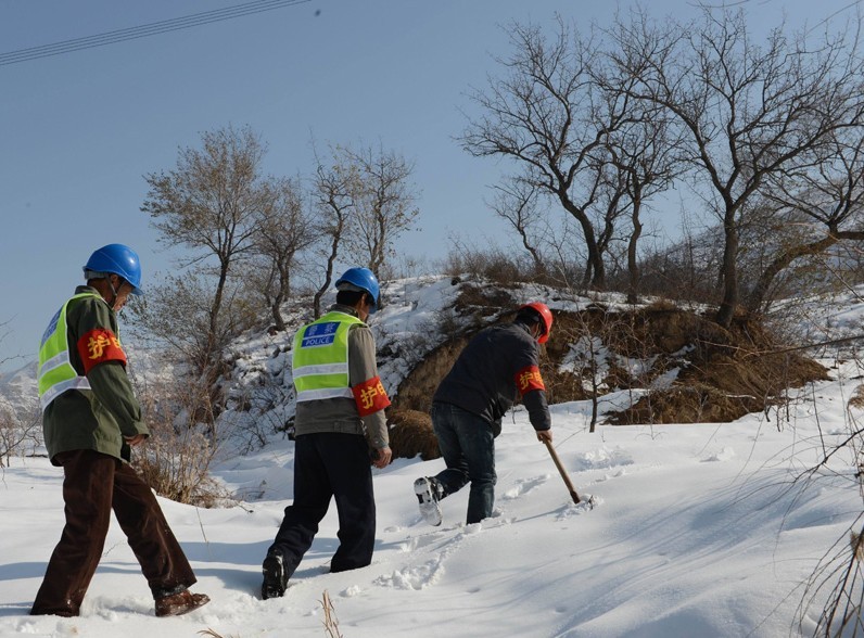 跟他們聊得正是起勁,記者回頭一看,只見(jiàn)三位群眾護(hù)員拿著鐵鍬邊清理積雪,邊往山上爬。不遠(yuǎn)處,一座500千伏線路的鐵塔,正在閃閃發(fā)光。他們告訴記者,今天是十八召開(kāi)的第一天,屬于特殊時(shí)段,每天要不間斷的巡查,遇有危害鐵塔和線路情況馬上就得向電力部門(mén)報(bào)告。