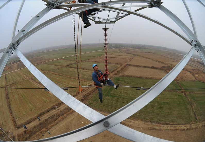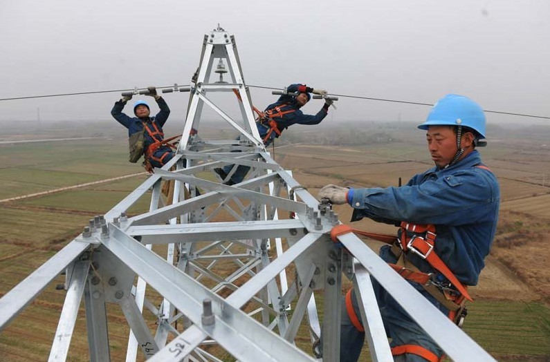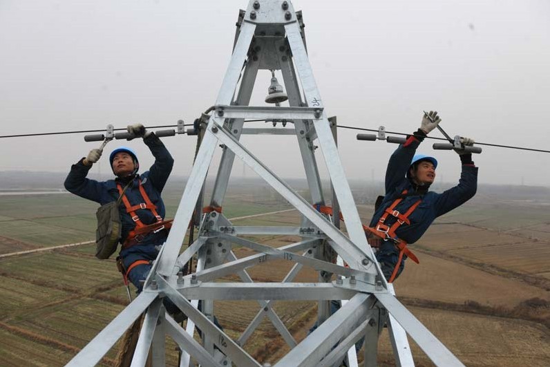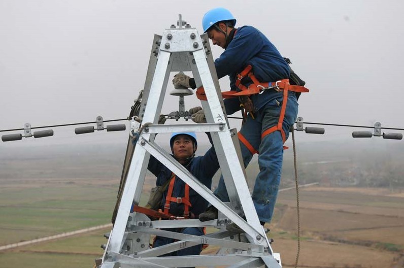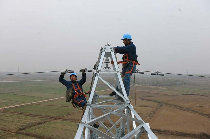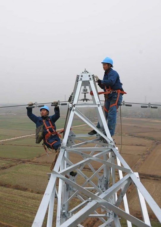 在安徽省定遠(yuǎn)縣池河鎮(zhèn)劉鋪村,國(guó)家電網(wǎng)安徽滁州供電公司的電力工人在50多米的高空冒著細(xì)雨進(jìn)行架線(xiàn)作業(yè)。當(dāng)日,隨著鳳(陽(yáng))定(遠(yuǎn))2858輸電線(xiàn)路的最后一根架空導(dǎo)線(xiàn)架設(shè)完成,安徽省滁州電網(wǎng)迎峰度冬7號(hào)工程—