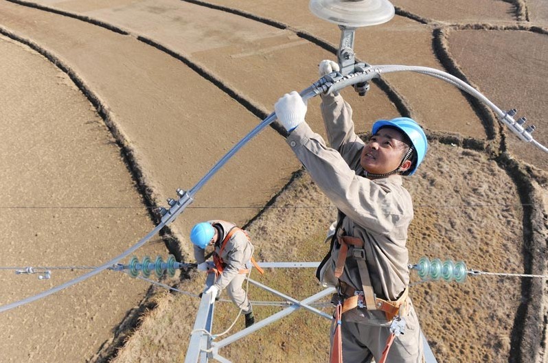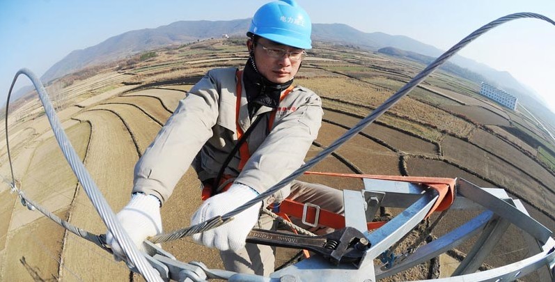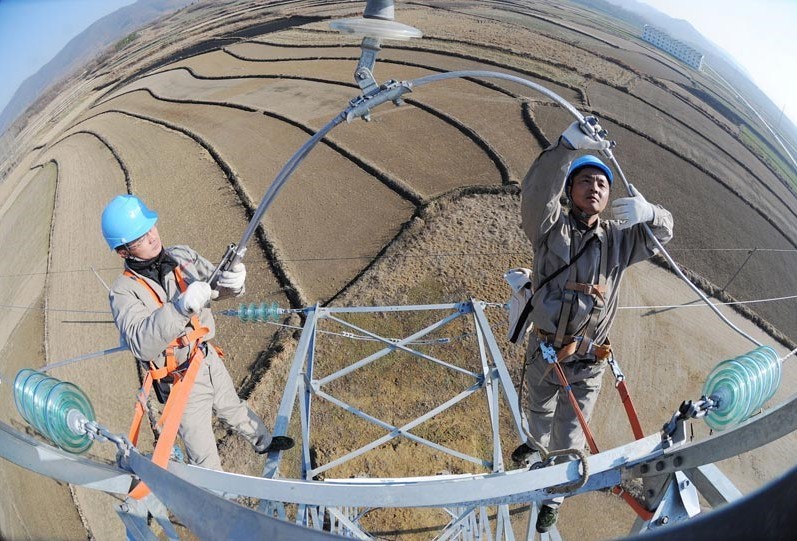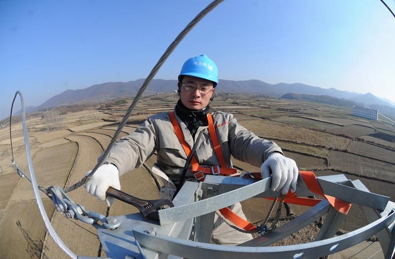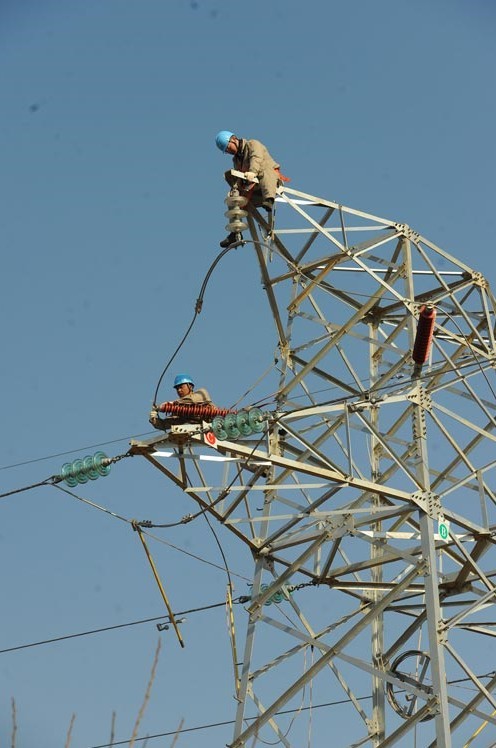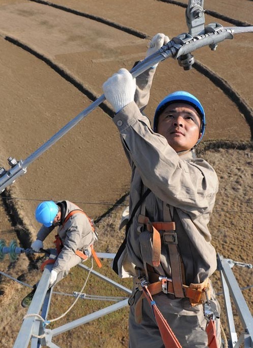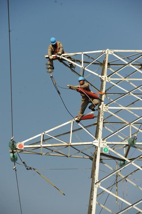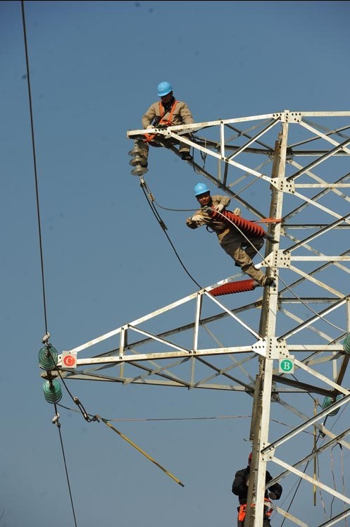 2013年1月18日,在安徽省滁州市珠龍鎮(zhèn)北關(guān)村,電力工人在高空對(duì)輸電線路進(jìn)行技術(shù)改造。當(dāng)日,安徽省滁州市迎來(lái)今冬用電日最高負(fù)荷128萬(wàn)千瓦。面對(duì)新一輪冬季用電負(fù)荷高峰,保證電網(wǎng)安全運(yùn)行,國(guó)家電網(wǎng)安徽省滁州供電公司提前制訂了巡檢重點(diǎn)線路和設(shè)備、開展電網(wǎng)反事故處置演練、加強(qiáng)電網(wǎng)運(yùn)行值班和搶修力量等多項(xiàng)“迎峰度冬”保供電預(yù)案,并組織600余名技術(shù)人員利用晴好天氣對(duì)轄區(qū)供電設(shè)備和輸電線路進(jìn)行全面檢查、維護(hù),發(fā)現(xiàn)安全隱患及時(shí)處理,同時(shí)在全市部署極端氣候24小時(shí)故障快速搶修隊(duì)伍,確保轄區(qū)居民冬季用電安全。