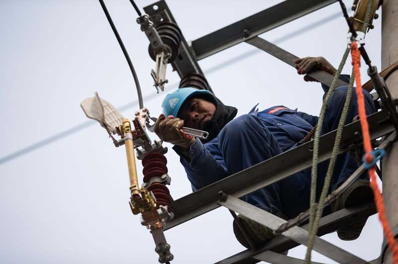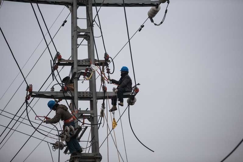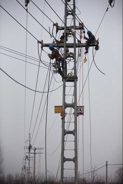 安徽淮北供電公司的工作人員在杜集區(qū)朔里鎮(zhèn)葛塘架設(shè)輸電線路。 臨近春節(jié),隨著返鄉(xiāng)農(nóng)民工增多和農(nóng)村用電負(fù)荷的增大,安徽省電力公司于近日開(kāi)展‘電’亮鄉(xiāng)村、溫暖冬日主題志愿活動(dòng),宣傳安全用