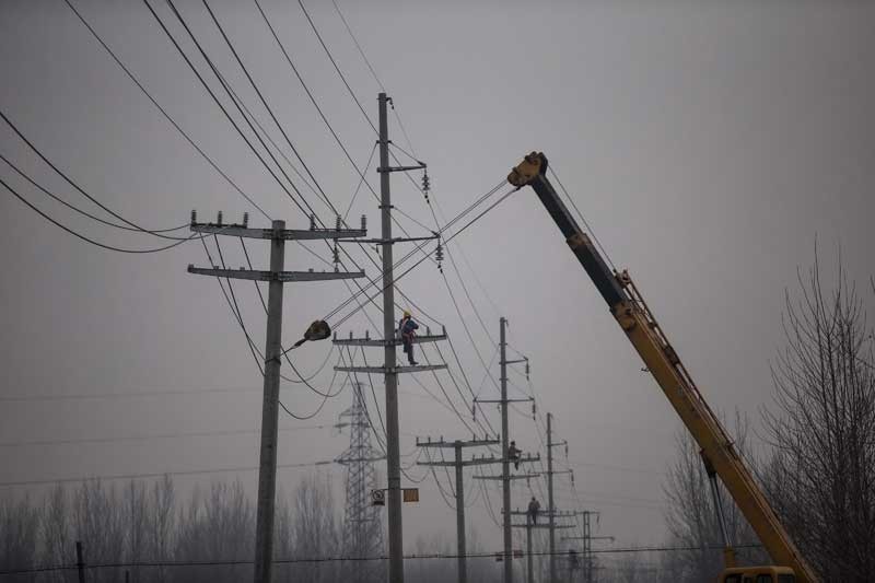 安徽淮北供電公司的工作人員在杜集區(qū)朔里鎮(zhèn)葛塘架設(shè)輸電線路。