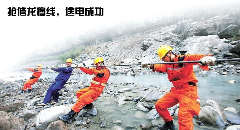 綿陽電業(yè)局的100余名員工于21日晚趕到寶興縣,搶修龍穆線是他們接到的第一項任務。22日上午,他們派出30余人把龍穆線的39基鐵塔和18.5千米線路全部巡視一遍。施工隊長張健說:“線路和鐵塔全部在山上,到達塔基就要花費大量時間。大家干完活在山下集結(jié)時都已經(jīng)到傍晚了。”