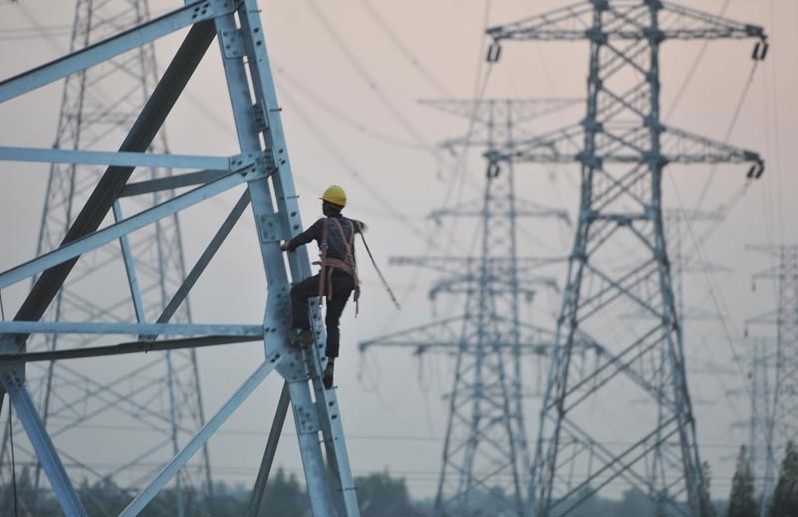 施工人員正在江蘇揚(yáng)州市瓜州鎮(zhèn)境內(nèi)新建的220千伏蔣橫線上組立塔。當(dāng)日,揚(yáng)州500千伏儀征變電站送出工程的2回220千伏迎峰度夏輸電線路建設(shè)全部進(jìn)入施工高潮,江蘇省電力公司組織多路施工隊(duì)伍進(jìn)場(chǎng)施工確保迎峰度夏工程工期。