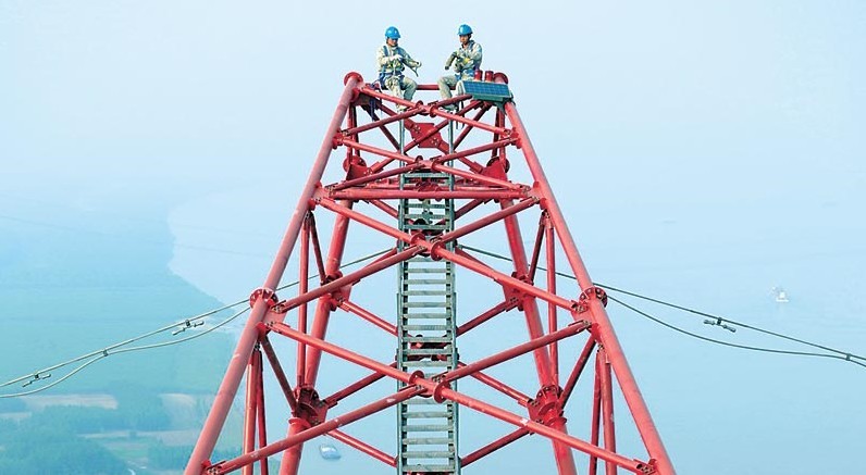 6月4日,在湖北荊州洪湖地區(qū)±800千伏錦蘇線路2576號(hào)長(zhǎng)江跨越高塔上,湖北省送變電工程公司應(yīng)急搶修中心維修人員身穿屏蔽服,在200米高空安裝新型無線同步航空障礙燈。因長(zhǎng)期戶外工作而出現(xiàn)故障的航空
