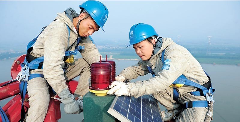 6月4日,在湖北荊州洪湖地區(qū)±800千伏錦蘇線路2576號(hào)長(zhǎng)江跨越高塔上,湖北省送變電工程公司應(yīng)急搶修中心維修人員身穿屏蔽服,在200米高空安裝新型無線同步航空障礙燈。因長(zhǎng)期戶外工作而出現(xiàn)故障的航空障礙燈得到及時(shí)更換。