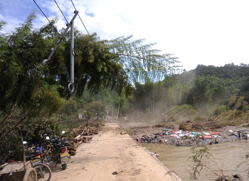 聽說孫村鄉(xiāng)碧云村5個臺區(qū)已經(jīng)在今天中午11點左右送電,下午4點多鐘,我們繼續(xù)趕往孫村鄉(xiāng)碧云村。洪水褪去之后的河道雖恢復了往日的寧靜,卻在河流旁的稻田里留下了大量沙石。剛剛被暢通不久的塌方多處可見,有些地方僅限一輛小車通行,電力搶修車拖著電桿在蜿蜒前行。沿途新架的10千伏碧云109線路在災后的深山里,格外的顯眼。