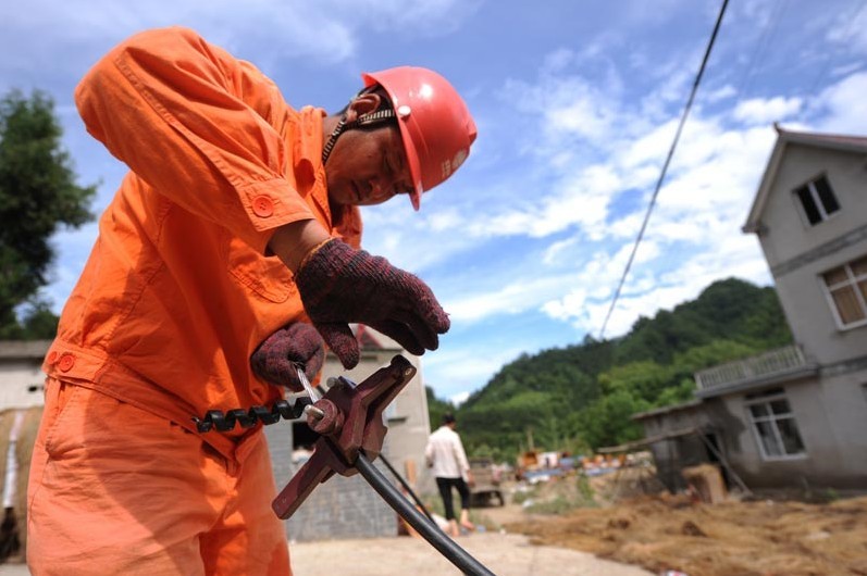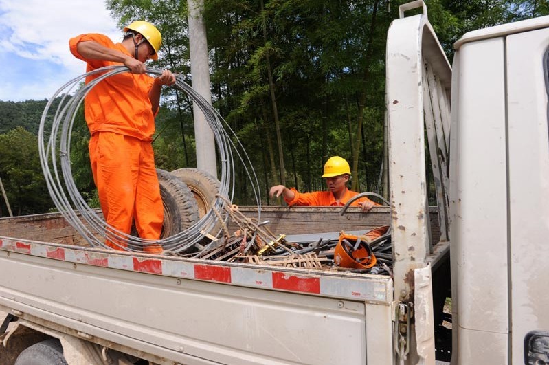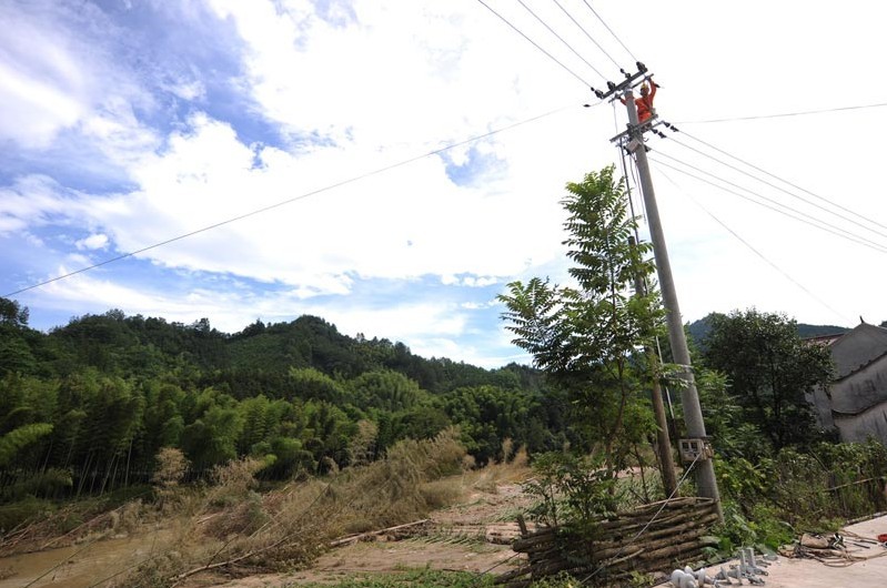 在現(xiàn)場,我們看到了旌德供電公司副總經(jīng)理周鵬,曬得黝黑的臉龐,干裂的嘴唇。根據(jù)領導分片帶隊的安排,從6月30日下午開始,他就在祥云村協(xié)調(diào)指揮搶修。據(jù)他介紹,7月1日受損道路暢通之后,搶修需要的電桿、變壓器、導線等物資已經(jīng)全部運輸?shù)轿唬?日的任務就是把祥云10千伏107主干線路全線架通,含宣城陽光公司共4支施工隊伍分布在祥云村的5個臺區(qū)。他指著電桿告訴我們,洪災襲擊后,原有河道旁的電力通道不能使用,采用將10千伏線路與380伏線路同桿架設、沿著公路等方式立桿架線。