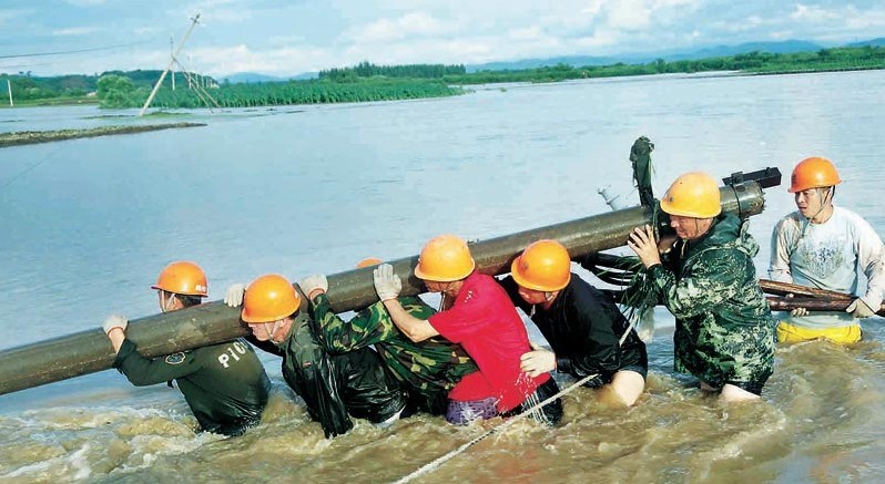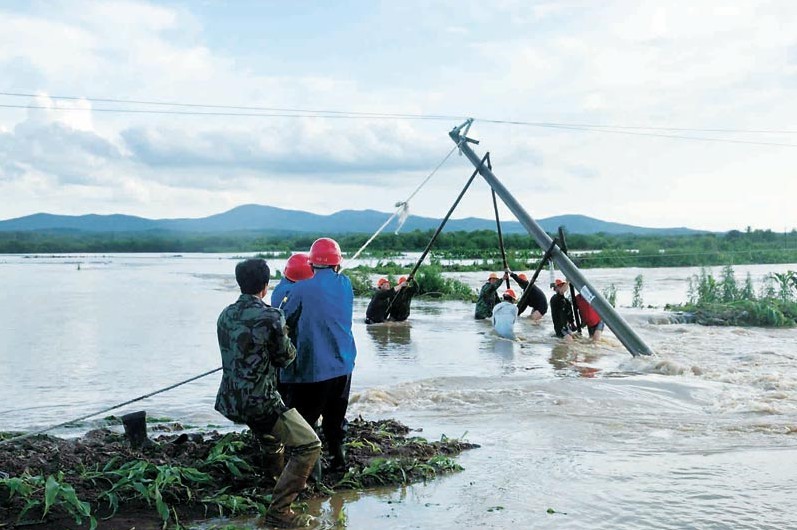 7月5日下午,黑龍江尚志市供電公司搶修人員在齊腰深的洪水中架設電桿。進入7月,連續(xù)強降雨導致尚志市多處河道漲水,部分地區(qū)突發(fā)山洪,多條10千伏線路不同程度受損。災情發(fā)生后,尚志市供電公司迅速啟動防汛預