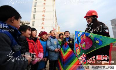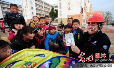 2014年3月4日,國網(wǎng)安徽肥西縣供電公司員工向孩子們講解放風(fēng)箏安全常識。