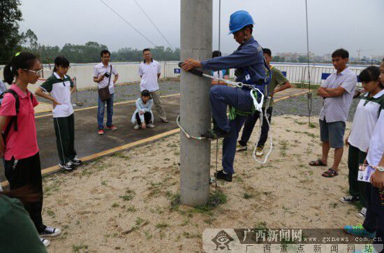 在活動最后,同學(xué)們來到欽州配電專業(yè)實(shí)訓(xùn)場,親身體驗(yàn)了一回電力工人的工作。“高壓電十分危險,這要求我們在工作中要嚴(yán)格按照操作規(guī)范進(jìn)行,才能保證自身的安全。”實(shí)訓(xùn)場的示范教員逐一向同學(xué)們介紹各種專業(yè)防護(hù)工具。在學(xué)習(xí)了基本的防護(hù)知識后,同學(xué)們體驗(yàn)了開關(guān)閉合、爬電線桿等項(xiàng)目。
