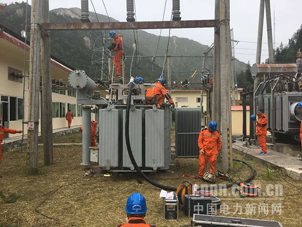 中電新聞網(wǎng)訊8月10日下午16時,國網(wǎng)四川電力應(yīng)急搶修隊正在110千伏九寨溝(甘海子)變電站安裝一臺35千伏變壓器。變壓器安裝調(diào)試投入使用后