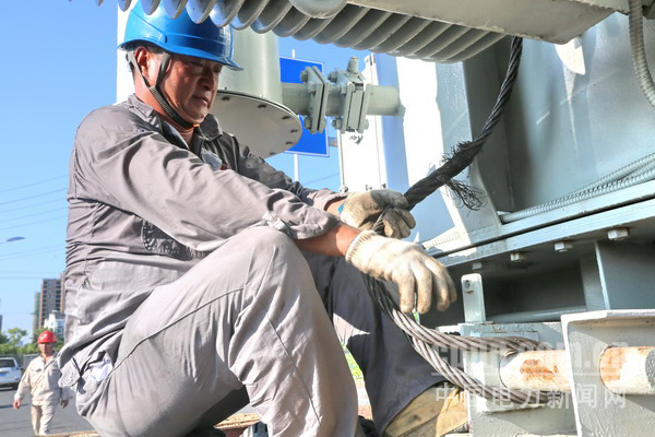 而此時(shí)段,該公司主要負(fù)責(zé)人已帶領(lǐng)20余名電力施工人員趕到了施工現(xiàn)場。施工任務(wù)是,將該站原#1主變因故障缺陷需卸載吊裝出站,等待檢修處置。昨夜運(yùn)抵的新#1主變需快速有序地進(jìn)行安裝、調(diào)試。鏖戰(zhàn)高溫、揮汗如雨、守護(hù)清涼的保電突擊戰(zhàn)即將告捷……