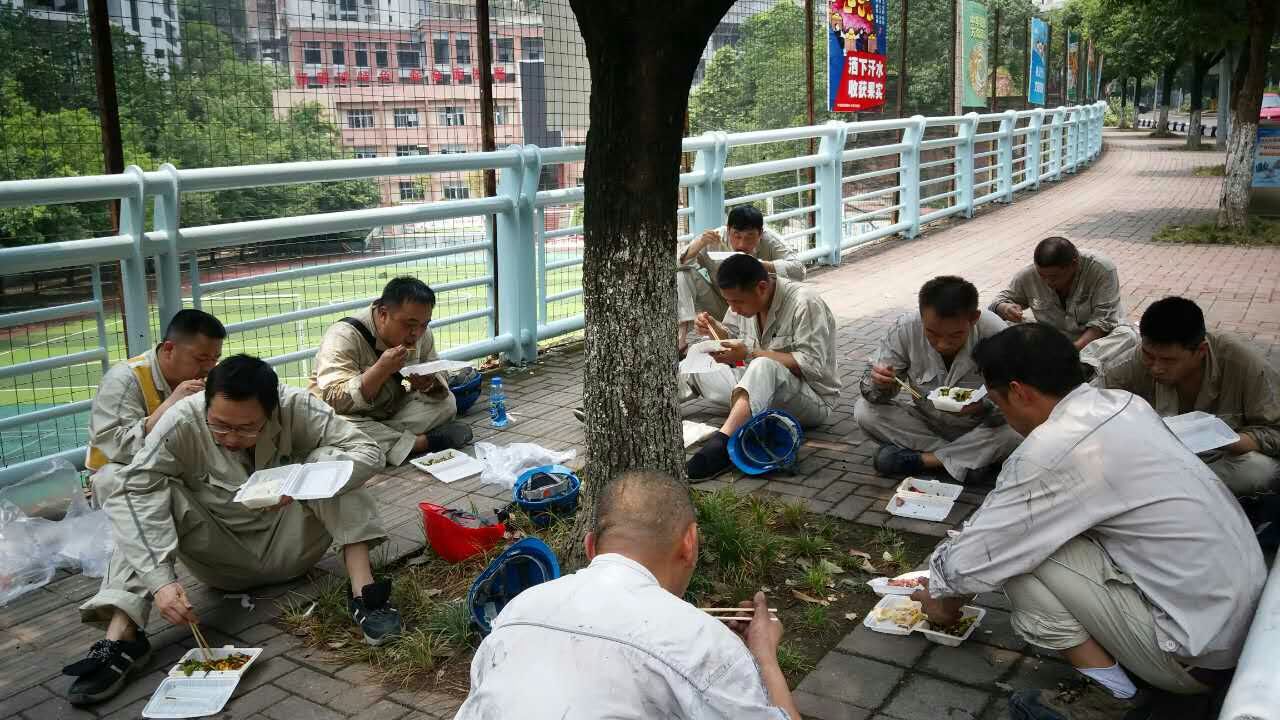 眾所周知,重慶是座火爐。當太陽漸漸升起,氣溫又逐漸直逼40度。高溫考驗著耐力,汗滴打濕了臉頰,而檢安公司的電黃牛們手里的工作從未懈怠。中午十二點,班長給大家點了盒飯,電黃牛們席地而坐,匆匆地吃了兩口盒飯,擦擦汗水,又繼續(xù)搶險工作。