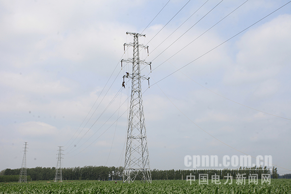 中電新聞網(wǎng)訊 通訊員 吳敬華 報(bào)道 7月21日,在山東省梁山縣供電公司110千伏電網(wǎng)加強(qiáng)線路23號(hào)鐵塔,作業(yè)人員冒著40攝氏度的高溫施工掛線,人在高高的桿塔上顯得非常渺小??崾罡邷亟z毫沒(méi)有影響施工,作業(yè)人員配合默契、業(yè)務(wù)嫻熟,各項(xiàng)工作流程按部就班、有條不紊。