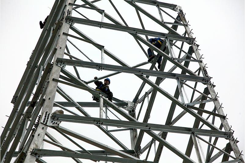 施工人員在內蒙古錫盟-江蘇泰州±800千伏特高壓直流輸電線路工程連云港市贛榆段沙河鎮(zhèn)施工現(xiàn)場進行直流輸電線路工程鐵塔組建作業(yè)。