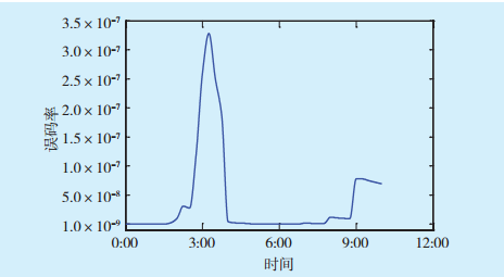 雨天誤碼率隨時間變化曲線如圖10所示。圖10中出現(xiàn)斷點的地方是誤碼率為零的時間段。當空氣中的水滴半徑大到一定數(shù)值時,它以一定的速率降向地面成為雨。雨不僅降低了地面溫度,消減了溫度差異,同時雨滴還減少了空氣中的不均勻成分,所以雨滴對光信號的散射衰減總體而言并不是很大。因此在小雨天氣情況下,信道衰減較穩(wěn)定,對誤碼率影響小。