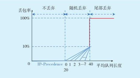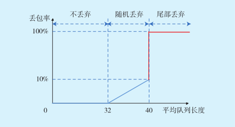 設T1=32,T2=40,按照上述規(guī)律,平均隊列長度在T1和T2之間時,進行報文丟棄過程,報文丟棄時采用線性丟棄概率,丟包率上升到10%最大。當平均隊列長度超過T2時,采取尾部全丟棄。