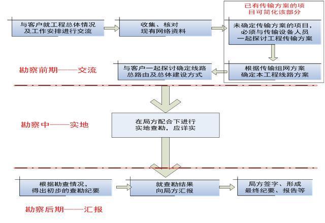 接入光纜工程現(xiàn)場勘察涉及三個主要步驟:為了便于理解,將勘察流程和要點簡化如下圖: