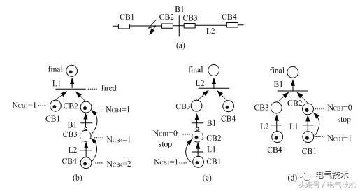 圖1(a)中線路L1出現(xiàn)故障后,則保護(hù)開關(guān)CB1動(dòng)作而CB2處保護(hù)不動(dòng)作,而CB4由于距離保護(hù)Ⅲ段條件滿足而動(dòng)作。系統(tǒng)中L1、L2以及B1的托肯躍遷如圖1的(b)、(c)、(d)所示。由于L1、CB1以及CB4的托肯能夠躍遷到final庫中,而L2和B1,CB1的托肯無法到達(dá)final庫,則得出可能存在問題的設(shè)備為L1。