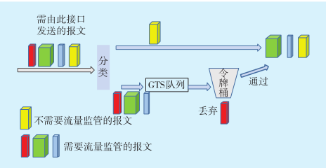 1)通用流量整形(GTS)。同CAR,均采用令牌桶技術控制流量。2種方法的區(qū)別為:使用CAR進行報文流量控制時,將丟棄不符合流量特性的報文;而GTS行程緩沖區(qū),將不符合流量特性的報文保留,減少了報文的丟棄。GTS示意如圖2所示,緩存報文稱為GTS隊列。