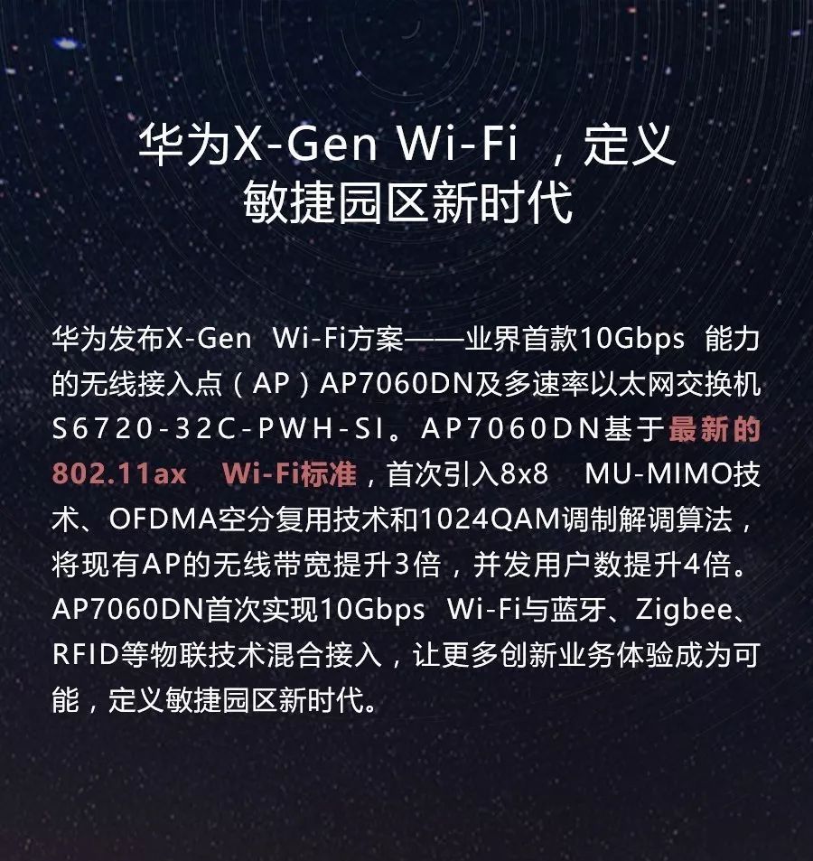 在2017全聯(lián)接大會(huì)上,華為發(fā)布X-Gen Wi-Fi解決方案該方案不僅將AP的無(wú)線帶寬提升3倍,并發(fā)用戶數(shù)提升4倍,還首次實(shí)現(xiàn)了10Gbps能力的Wi-Fi