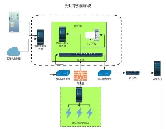 系統(tǒng)需要考慮實(shí)時(shí)氣象數(shù)據(jù)、電站功率數(shù)據(jù)、運(yùn)營(yíng)數(shù)據(jù)的搜集,所以系統(tǒng)是由數(shù)據(jù)采集、數(shù)據(jù)處理、遠(yuǎn)程氣象數(shù)據(jù)模型、光伏功率預(yù)測(cè)軟件、圖形處理等模塊組成,同時(shí)考慮到安全性和安全傳輸?shù)囊?guī)定,需要加上相應(yīng)功能匹配的服務(wù)器、反向隔離安全裝置、防火墻、縱向隔離裝置、交換機(jī)等硬件設(shè)備,整個(gè)系統(tǒng)架構(gòu)需符合電力生產(chǎn)數(shù)據(jù)傳輸安全規(guī)定。
