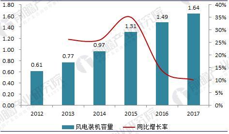 圖表1:2012-2017年中國風電裝機容量變化趨勢圖(單位:億千瓦時,%)