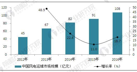 統(tǒng)計數(shù)據(jù)顯示,2012年我國風電運維市場規(guī)模在45億元左右,隨著近年來一大批風電機超過質保期,我國風電運維迎來了發(fā)展機遇期。2016年行業(yè)市場規(guī)模在108億元左右,近年來均保持10%以上的增速。預計“十三五”期間行業(yè)仍將保持較快的增速。